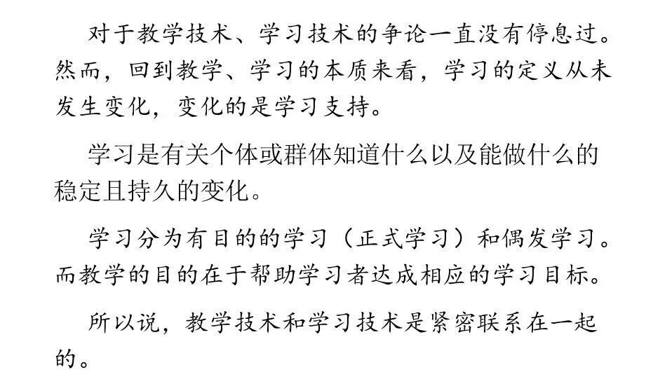 然而就学习领域而言,我们并不需要新的单词。几千年以来,学习的定义一直没有变化:学习是有关个体或群体知道什么以及能做什么的稳定且持久的变化。学习的概念本身并未改变,改变的是如何支持学习的方式。正因如此,学习与教学的区别被过分强调了,特别是在美国。我们应该明确教学只是用来支持有目的的学习,无论你如何设计和策划教学,都是用来支持学习的。因此,教学和学习两者是紧密联系在一起的。我们所关注的这类学习就是学习的意义之所在。学习是有组织的,因此有目的的学习是有学习目标的,而教学的目的在于帮助学习者达成学习目标。在美国,那些赞成“教学技术”的人和赞成“学习技术”的人曾有过非常虚伪而愚蠢的论战。实际上,一旦讨论“学习技术”,这二者就要连接在一起。赞成“教学技术”的人已经明白了这一点,但是仍然有一些赞成“学习技术”或者“学习科学”的人没有明白“学习”和“教学”的这种紧耦合关系。在欧洲,本领域的主要期刊都以“学习教学”来命名,因此不存在这样的争论。在我看来,“教育技术”是一个更为广泛的术语,它涵盖所有的内容,这是合适的,我也更喜欢使用“教育技术”这种说法。