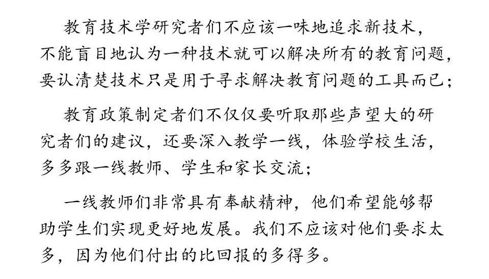 访谈者:确实如您所言,教育技术领域的研究者不应该一味地追求新技术,不能盲目地认为一种技术或途径就可以解决所有的教育问题,要认清楚技术只是用于寻求解决教育问题的工具而已;教育政策制定者也需要多深入教学一线,体验学校生活,多跟一线教师、学生和家长交流。谢谢您与我们分享,再次感谢您接受我们的采访。