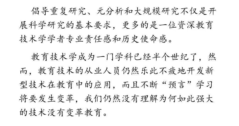 迈克尔·斯佩克特:写此文主要有两个原因:其一,我在这个领域已有很长时间,我想对过去50 年所发生的事情进行回顾与思考。我们总是妄下结论——学习将要发生很大改变。事实上,虽然我们所处的技术环境已经发生了很大变化,但是学习却并没有发生改变。因此,我想弄清楚为什么当前如此强大的技术却没有起到应有的作用。其二,我在思考教育技术学的科学本质。如果我们承认所从事的是科学事业或者说是工程事业,那么我们应该进行知识的积累。