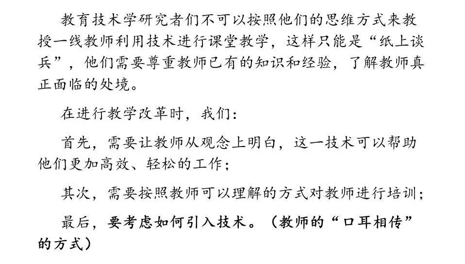 教师总是希望自己能够真正帮助学生的学习,但是他们却非常忙。因此,如果你打算让教师发生显著的改变,这就是我想提的第二个教训,这一教训与技术有关,并且可能发挥作用。首先,我们需要让教师明白,使用这一技术可以帮助他们更加高效、轻松地工作,这样他们就能抽出更多时间来做一些他们真正想在教学中做的事情。其次,作为研究者和专业学者,一直以来我们忽略了这样一个事实:我们认为合适的事情,教师们却不一定认为合适。我们需要向教师阐明如何使用技术更好地支持教学,并且帮助他们实现这一目的。最后,我们需要考虑如何引入这些技术。如果通过“自上而下”的方式引入技术,教师会觉得他们的选择权和决定权被剥夺了。我曾在美国东南部经济落后地区的乡村学校开展过一项大型项目。起初我以为这些教师可能会做得不好,但事实证明我的想法是错的。教师是这个地区最稳定的职业,他们在这个岗位上受到极大的尊重,但是他们却没有权利决定在教学中使用哪种技术,也不懂得如何把技术整合到教学中。于是,我把从过去汲取的教训应用到这个项目中,即不直接把需要使用的技术提供给教师,而让他们自己来选择使用何种技术。教师通过“口耳相传”的方式将技术如何在教与学中发挥作用传递给其他教师,而不是由我们直接告诉他们。这会比单纯讲授有效得多。事实证明,参与项目的学校都甩掉了教育落后的“帽子”,有一所学校甚至还名列前茅。项目组离开多年后,有一所学校仍然做得非常好。总之,无论如何,我们仍希望教师能够清楚自己的需求,而且也要相信他们做得是对的,但是我们更需要向他们展示技术是如何帮助他们改善学习和教学的。