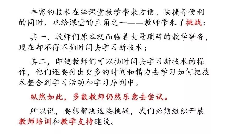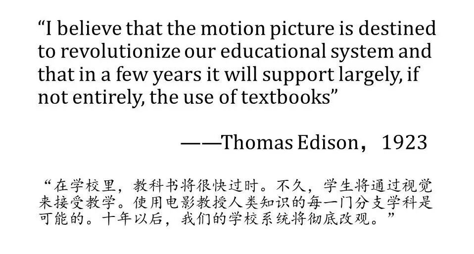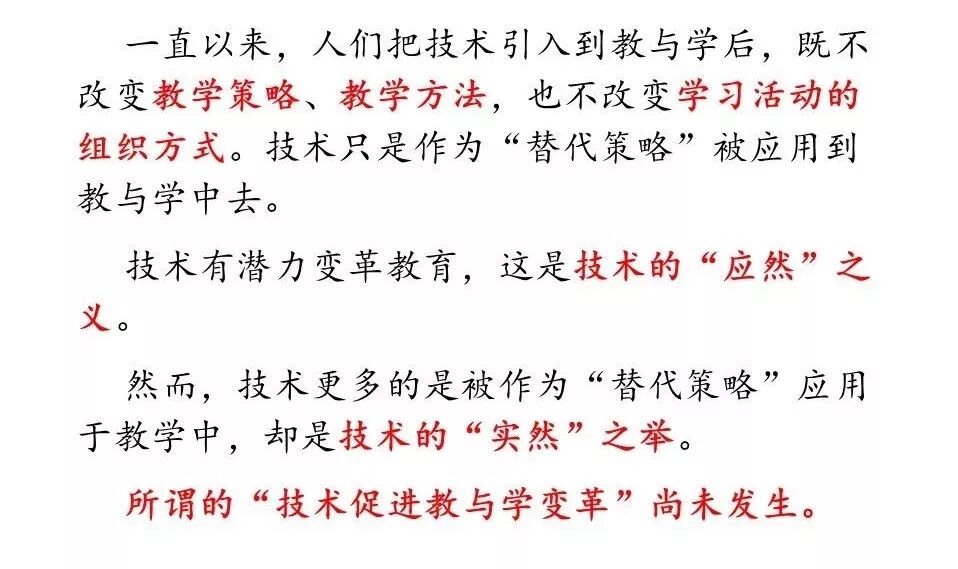 如果真的希望变革学校教育,需要的不仅仅是技术,还需要在教师培训、教师教育、教学支持、教学维持、评价方式和课程重构等方面下很大功夫。技术只是教育变革中的“沧海一粟”,不足以支撑整个教育系统变革的发生。因此,“技术促进教与学变革”还没有发生。