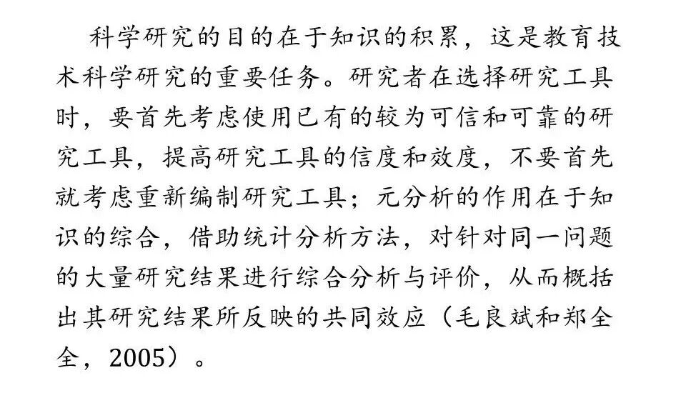 元分析是进行知识累积的另一种方式。一般来说,实验研究中都会报告效应值。针对某些特定的研究话题,比如什么会影响协作学习,什么会影响八年级学生科学课程的学习,你会查找与之相关的所有研究资料,通过查看一系列效应值来了解它在其他情境中会产生怎样的影响。因此,元分析是重要的,但是教育技术学领域的研究者通常都不进行元分析。