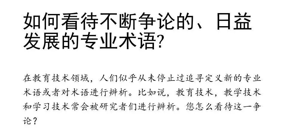 访谈者:在教育技术领域,人们似乎从未停止过追寻定义新的专业术语或者对术语进行辨析。比如教育技术、教学技术和学习技术常会被研究者们进行辨析,又如网格计算、分布计算和云计算也是一组值得辨析的专业术语。您怎么看待这些争论?