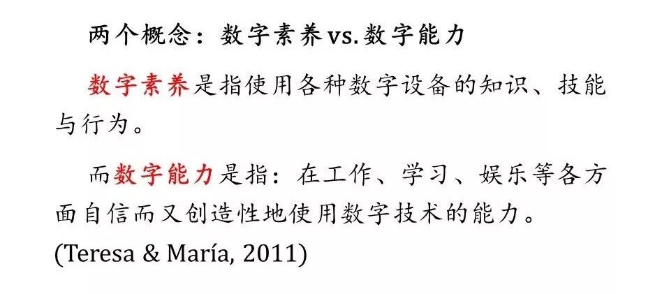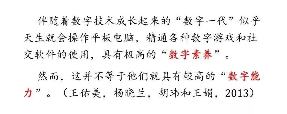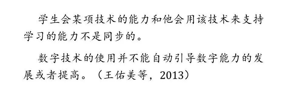 访谈者:是的。我们的理解是,数字素养是指使用各种数字设备的知识、技能与行为。而数字能力是指在工作、学习、娱乐等各方面自信而又创造性地 使 用 数 字 技 术 的 能 力 (Torres-Coronas et al.,2011)。伴随数字技术成长起来的“数字一代”似乎天生就会操作平板电脑,精通各种数字游戏和社交软件的使用,具有极高的“数字素养”,然而这并不等于他们就具有较高的“数字能力”。由此我们想到在 PISA 测验中的“中国现象”:接受测验的学生更擅长阅读连续性文本,而在阅读非连续性文本(如读图、读表)方面则表现得不尽人意。前者侧重于信息检索能力,后者侧重于信息提取能力。这两种能力并不是同步增长的。换言之,学生会某项技术的能力和他会用该技术来支持学习的能力不是同步的。数字技术的使用并不能自动引导学生数字能力的发展或者提高。