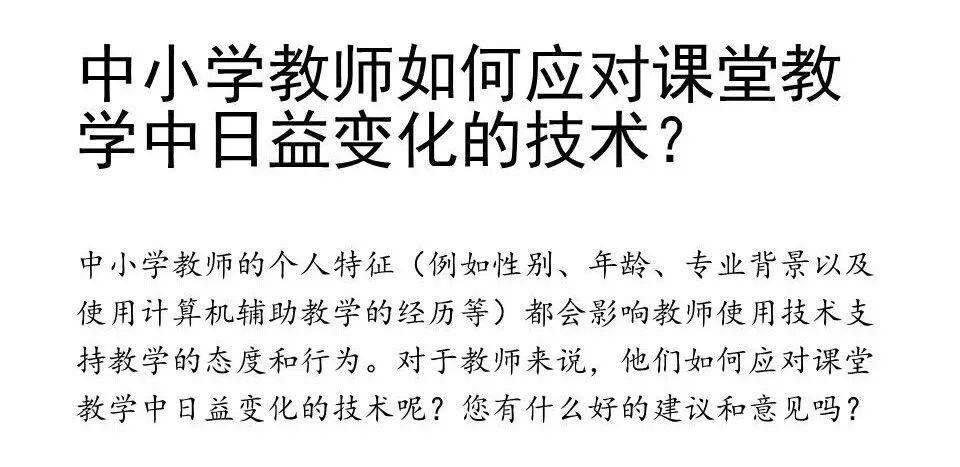 访谈者:教师的个人特征(如性别、年龄、专业背景以及使用计算机辅助教学的经历等)都会影响其使用技术支持教学的态度和行为。对于教师来说,他们该如何应对课堂教学中日益变化的技术呢?