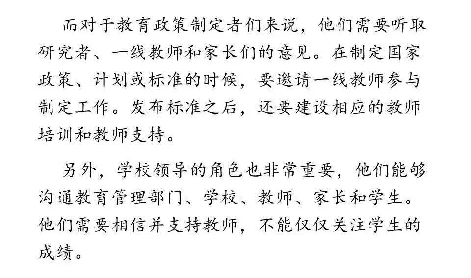 迈克尔·斯佩克特:对于教育部门的管理人员而言,这些政策制定者和管理者需要有选择地去听取一些研究者的建议。通常来说,他们往往会听取那些最知名研究者的意见,但是这些研究者的呼声不一定都是适合的,因为他们很少跟教师交流,也可能较少考虑学习者本身。因此,他们制定的政策往往也难以发挥作用。他们应该回到现实中,走到学校里与学生们生活一段时间,然后再看看会发生什么。