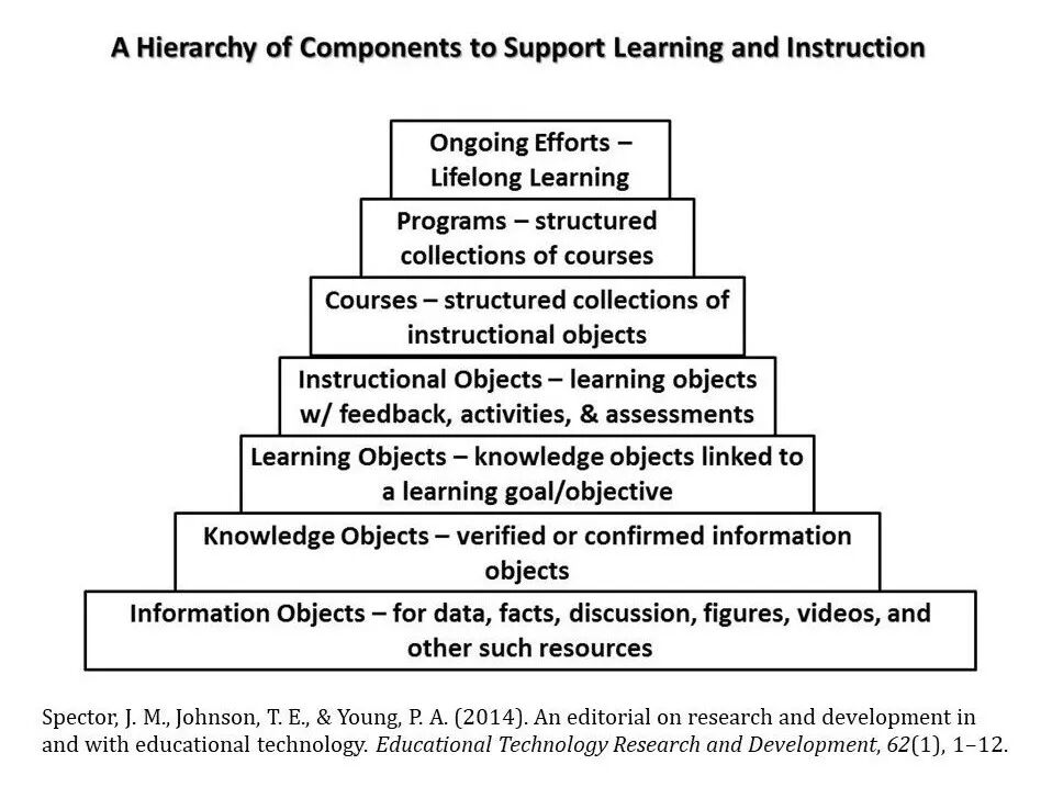 访谈者:您和《教育技术研究与发展》杂志的另外两位编辑在 2014年发表了有关“支持学与教的要素层次模型”(Spector et al.,2014)。这一模型从下至上依次包含信息对象、知识对象、学习对象、教学对象、课程、项目以及终身学习。该模型中的每一个组件都是建立在前一个组件基础之上。您在另一篇文章《关于 MOOCs 的评论及微型MOOC》中指出,“多数的 MOOCs 实际上不是课程”,“MOOC中代表‘课程’(Course)的 C应该由 ‘ 资源 ’ (Resource) 的 R 代 替 ”, “ 多数MOOCs更像是社区” (Spector,2014)。您能否进一步解释一下MOOC为什么不是课程?