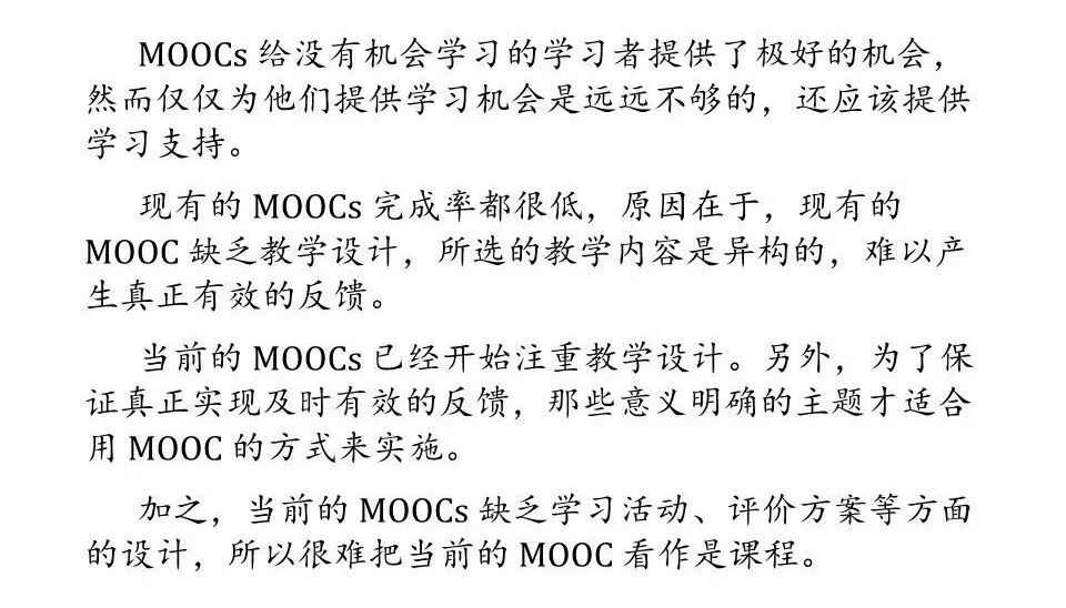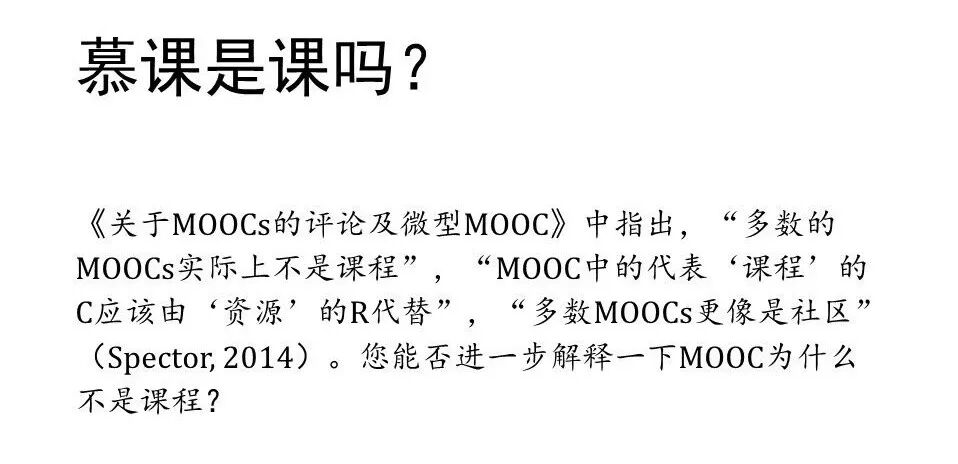 迈克尔·斯佩克特:MOOCs 现在备受吹捧和关注。而让我担心的是,人们普遍认为 MOOCs 会变革一切,“大学也将因此而变得有所不同”。这种看法显然是荒谬的。诚然,通过 MOOCs我们可以轻易地影响到成千上万的人,在此之前却很难做到这一点。但是,提供这样的学习机会并不等于也提供了相应的学习支持。加拿大最早开展的 MOOC就是以社区的形式而不是以课程的形式来实施的。他们的做法是:先向少数学习者开放课程,继而把课程推广到更大的社区中。这种 MOOC 其实就是一个社区,而不是课程。现在那些声称是课程的MOOCs 多数都是按照加拿大这种方式发展的,麻省理工学院、哈佛大学和斯坦福大学做了类似的事情。在斯坦福大学,一位人工智能领域的知名教授将他的课程讲稿和录像上传到网上,他们就称这是 MOOC 了。我不这样认为,有一万人注册这门课程,确实很了不起,然而只有很少的人完成了课程,这个完成率非常低。这足以说明他们忽略了一些因素。首先,他们没有进行教学设计,所谓的MOOC 仅仅是一位知名教授的想法而已。因此,和其他一些在线学习环境一样,MOOC也需要教学设计师的参与。事实上,现在一些新推出的 MOOCs正在招募教学设计师,这样你就可以在 MOOCs 上体验更合乎逻辑的教学活动和学习资源序列。其次,MOOCs 没有产生真正有意义、及时且过程性的反馈。研究生的人工智能课程并不适合作为一个MOOC 的主题,这是因为在一个问题解决活动中,为一万个人提供及时、有意义的形成性反馈是不可能的。因此,对于MOOC 来说,那些能够自动反馈的课程才是适合的,那些高度结构化和意义明确的内容才可以作为 MOOC 的主题。从这一意义来说,声乐、阅读技巧之类的课程是可以的,因为这类课程都可以使用计算机编制测验自动为学生提供讯息性和支持性的反馈。我把这种 MOOC 称之为“微型 MOOC ”。这正是我所追寻的。总之,第二个不当之处是绝大多数的 MOOCs都没能提供真正合适的反馈来保证学习的发生。 虽然 MOOCs原本是让那些没有机会学习的人能够有机会听取知名大学的课程,然而事实上并非如此。那些完成斯坦福大学 MOOC 的学习者一定在图书馆花了很多功夫去查阅人工智能的书籍。这才是学习。MOOC并没能帮助到学习者,只是为那些有较高学习动机和学习基础的人提供了帮助。