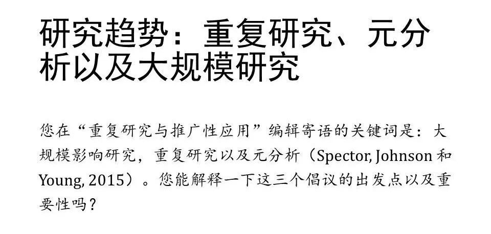 访谈者:您在“重复研究与推广性应用”编辑寄语中的关键词是大规模影响研究、重复研究以及元分析(Spector et al., 2015)。您能解释一下这三个倡议的出发点及其重要性吗?
