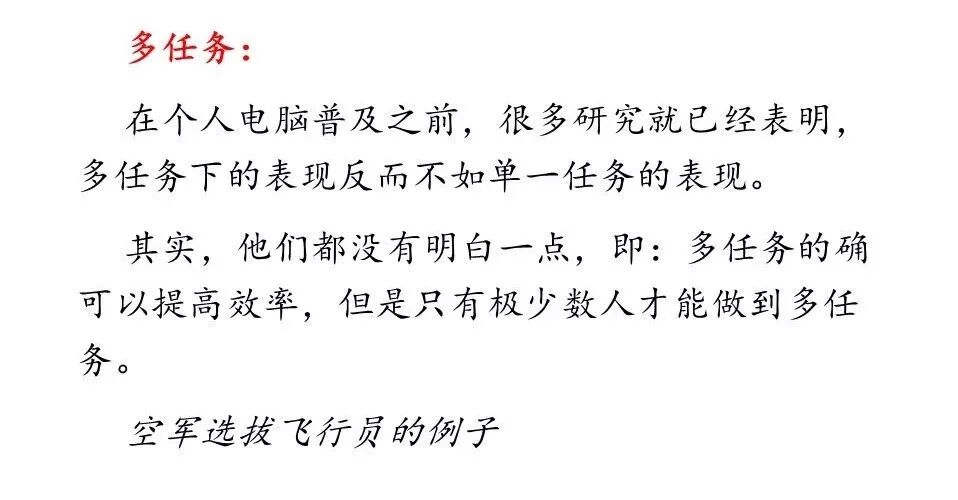 第一,数字时代的每一个人都是一样的。这种想法很不切实际。如果我们认为那些伴随数字技术成长起来的从小就能使用智能手机上网的孩子都是一样的,那我们就错了。即使他们能熟练地在手机上使用社交软件(如 Facebook 等)来交朋友,但是他们却不知道该如何利用这些技术来支持自己的学习。因此,“数字素养”并不是最重要的,最重要的是学会使用这些技术来支持自己的学习。虽然学生可能比教师接触到更先进的技术,但是教师却更擅长利用技术支持教学和学习。第二,“数字一代”普遍具有这样的错误认识:即他们总以为多任务会让他们更有效率。比如,他们现在有 4G 网络,可以多窗口操作,可以一边聊天,一边做家庭作业。然而,在个人电脑普及之前,很多研究就已经表明,多任务下的表现反而不如单一任务的表现。虽然多任务的确可以提高效率,但是只有极少数人才能做到多任务。例如,飞行员在工作中既要关注飞行器的工作状态,又要接收外部的各种命令或者信号,所以飞行员必须要有多任务并发处理的能力,但是只有极少数的人可以通过选拔。