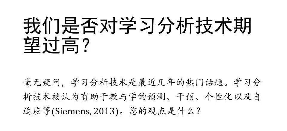 访谈者:毫无疑问,学习分析技术是最近几年的热门话题。学习分析技术被认为有助于教与学的预测 、 干 预 、 个 性 化 以 及 自 适 应 等 (Siemens,2013)。您的观点是什么?