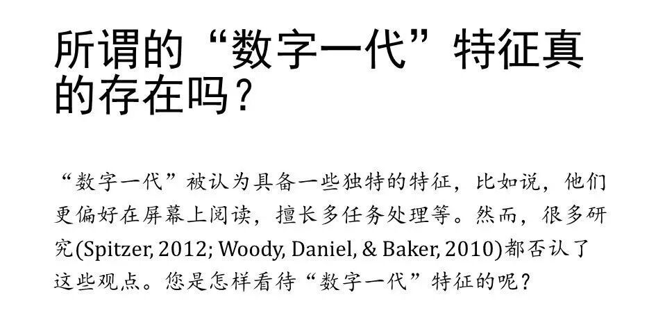 访谈者:“数字一代”被认为具备一些独特的特征,比如他们更偏好在屏幕上阅读,擅长多任务处理等。然而,很多研究(Woody et al.,2010;Spitzer,2012)都没有证实这些观点。您是如何看待“数字一代”的特征?