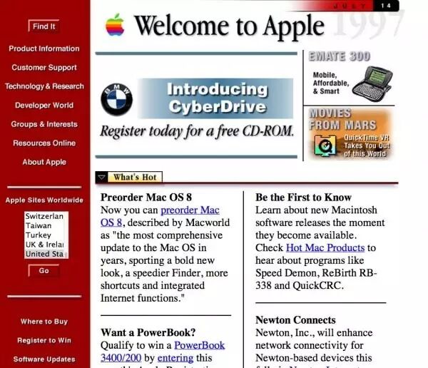 是不是有一种点了“澳门博彩娱乐”广告的错觉,红白的大胆配色,超链接的醒目提示,以及花里胡哨的苹果Logo……额……这个Logo其实已经是被简化过的……想想一下1976年初代的苹果Logo出现在你的iPhone7背面,画面太美……